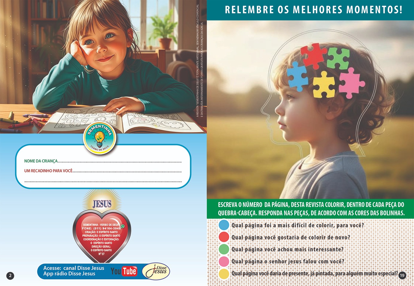 A Sementinha é muito mais que uma revista de colorir; é um convite para a criança participar ativamente das histórias bíblicas! Através de traços simples e desenhos encantadores, cada página é uma oportunidade para os pequenos darem vida aos ensinamentos de Jesus enquanto desenvolvem a coordenação e a imaginação.